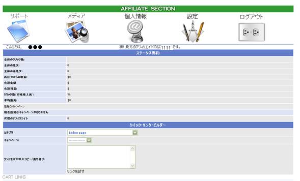 管理画面 アフィリエイトに登録すると、売上統計情報などをリアルタイムで確認することができる便利なアフィリエイト専用ページがあります。 アフィリエイト専用のぺージでは、トップ画面からおおまかなアフィリエイト状況(クリック数、金額注文の詳細)を確認することができます。メディアぺージには、アフィリエイト用バナー素材、設定ページでは基本情報の確認や変更ができます。